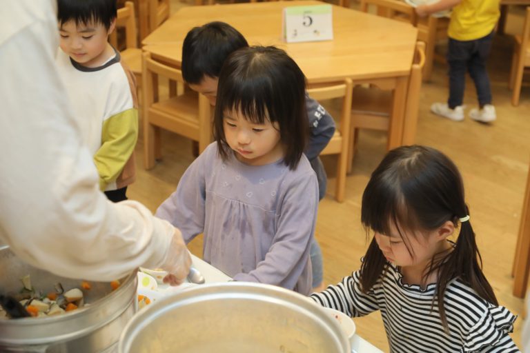 保護者の方はご存知のように、大久保わかくさ子ども園では、食事の分量を子どもに聞いてよそっています。自分の食べる量は自分で決めてもらっています。そうすることで自分の好き嫌いや食べられる適量を知るためです。また、保育者も子どものそばで食べるのですが、それは注意するためではなく、一緒に食べることを楽しむためです。食べるメニュー(献立)、食べる場所、食べる時間は基本的に大人が決めますが、食べる分量は子どもが決めるのです。