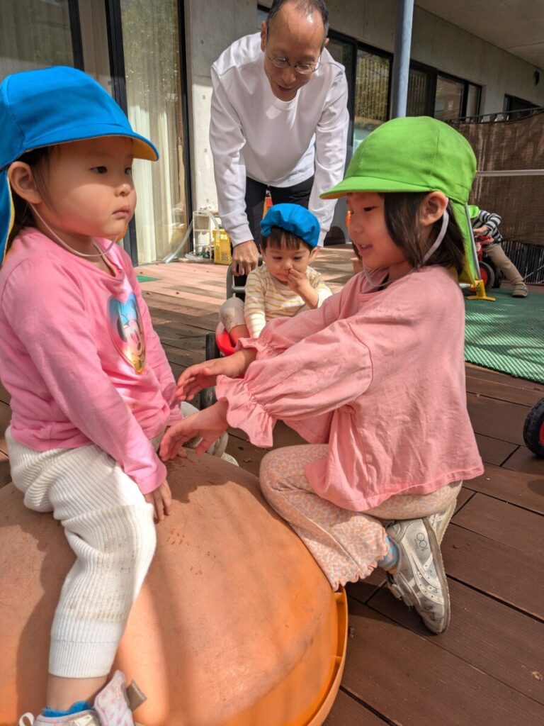 一歳クラスは言葉だけでなく、身体の発達や認知の発達が顕著にみられます。外遊びをするのに階段を登ったり、靴と格闘したり、自転車にふらふらしながら乗ったり、モノとの関わりがすごく大きいのだと思いました。そして、先生方もそのプロセスに時間をかけて経験させているようでした。それを考えるとこども園の環境は入念に組み入れられた教材なんだと思いました。